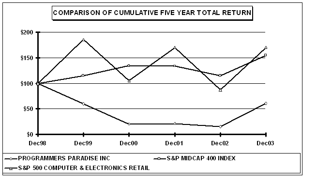 Set forth below is a line graph comparing the yearly percentage change in the cumulative total shareholder return on the Company's Common Stock with the cumulative total return of the S&P Midcap 400 Index and the S&P 400 Computer and Electronics Retail Index for the period commencing December 31, 1998 and ending December 31, 2004 where $100 was invested on December 31, 1998.